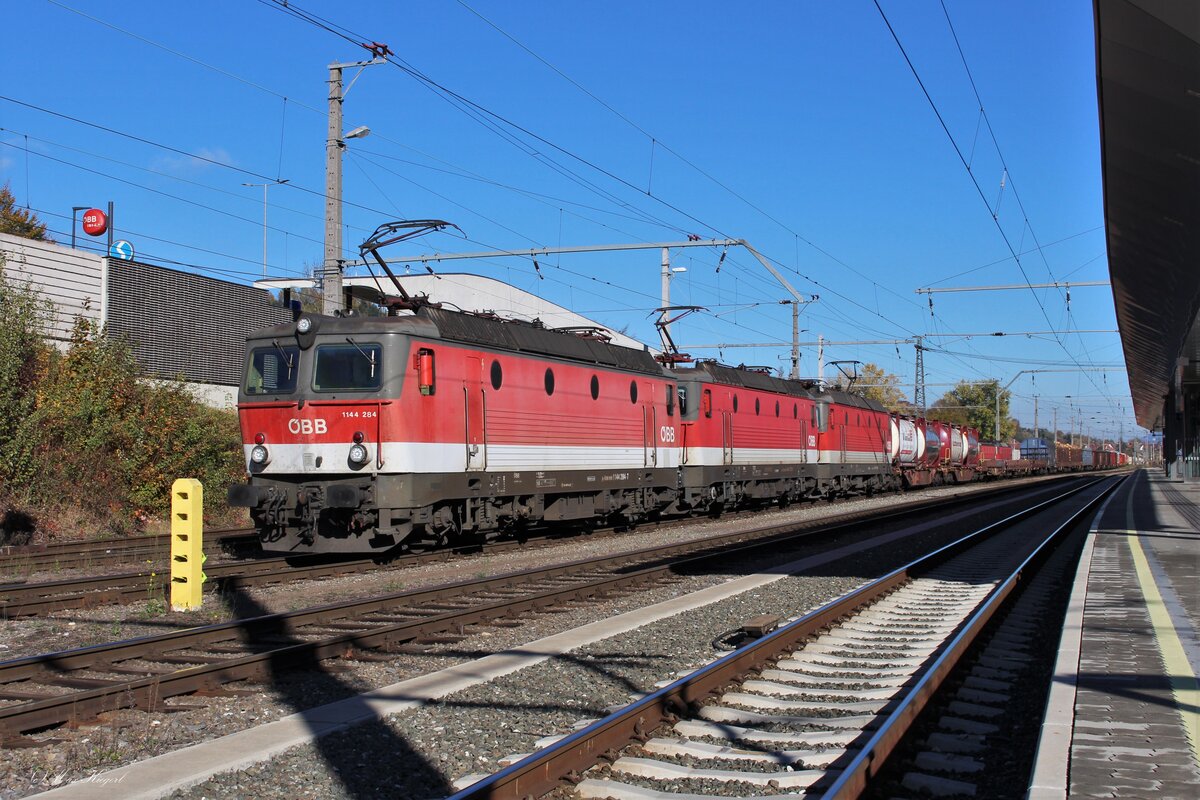 Am 1.11.2023 brachten die 1144 284, 1144 239 und die 1144 088 den 1600t schweren DG54703 von Wien Zvb nach Kapfenberg wo die 1144 284 vom Zug ging und die 1144 239 und die 1144 088 fuhren weiter an das Ziel Graz Vbf. Max Kiegerl