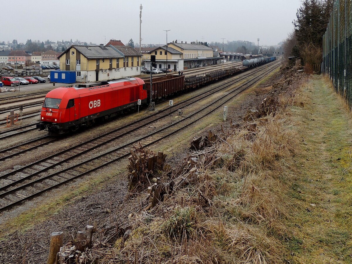 2016 073-6 verlässt mit einem Güterzug den Bhf. Ried; 250204