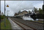 In Dampf gehüllt verlässt die Eurovapor 77 250 (österreichische 77.25) am 14.09.2024 mit dem GleisGlück-Sonderzug (DPE 90098 Geroldshausen - Lohr Bahnhof) den Bahnhof Geroldshausen. Die 23 058 schiebt den elf Wagenzug (Fränkische Museumseisenbahn Nürnberg & 2 Silberlinge von Eurovapor) nach.