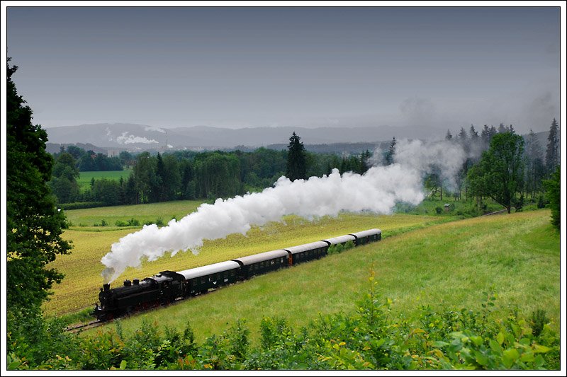 Am Vormittag des 1.6.2009 standen wir schon an der gleichen Stelle und fotografierten 77.28 bei schlechtem Wetter mit ihrem Personenzug von Timelkam nach Ampflwang.