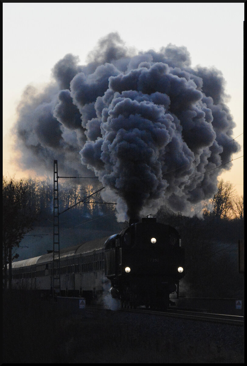 Eurovapor 77 250 mit dem GleisGlück-Sonderzug am 28.12.2025 auf der Werntalbahn bei Km 3,2 nahe Zeuzleben. Am Zugschluss hing die Dampflok 52 7409 (DGEG). HINWEIS: Ein Fahrleitungsmast und die dazugehörige Leitung wurden digital entfernt.