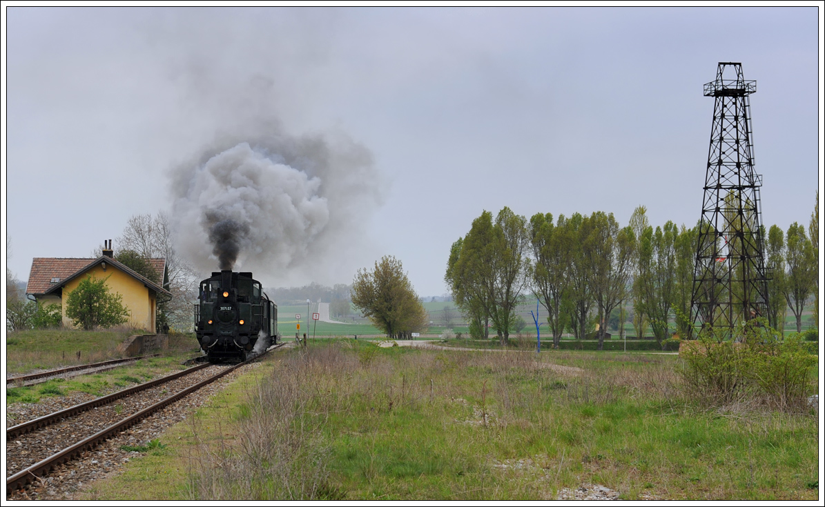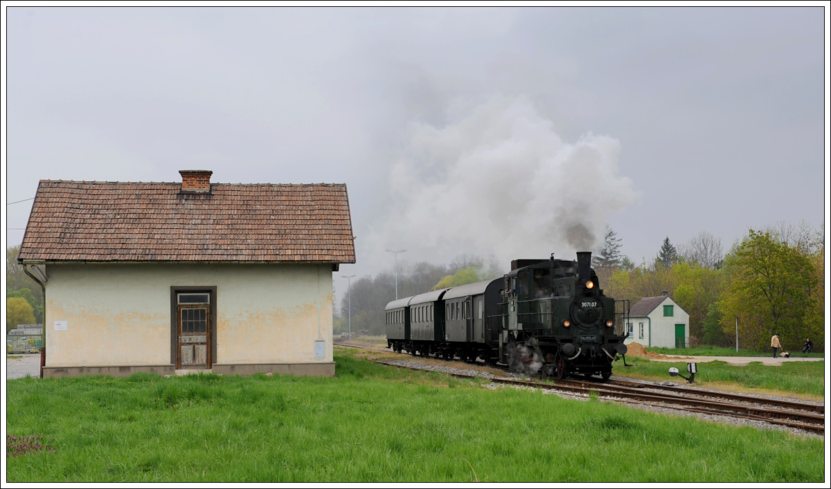 Der DT aus Strasshof wurde im Zuge einer Fotofahrt am 23.4.2010 in 3071.07 umbezeichnet und verkehrte von Mistelbach nach Hohenau als Nebenfahrt 19431. Die Aufnahme zeigt den Zug bei der Ausfahrt aus Dobermannsdorf. Mittlerweile ist diese Strecke Geschichte. OB es einem Verein gelingt, die Strecke zu reaktivieren, halte ich finanziell fast für unmöglich.
