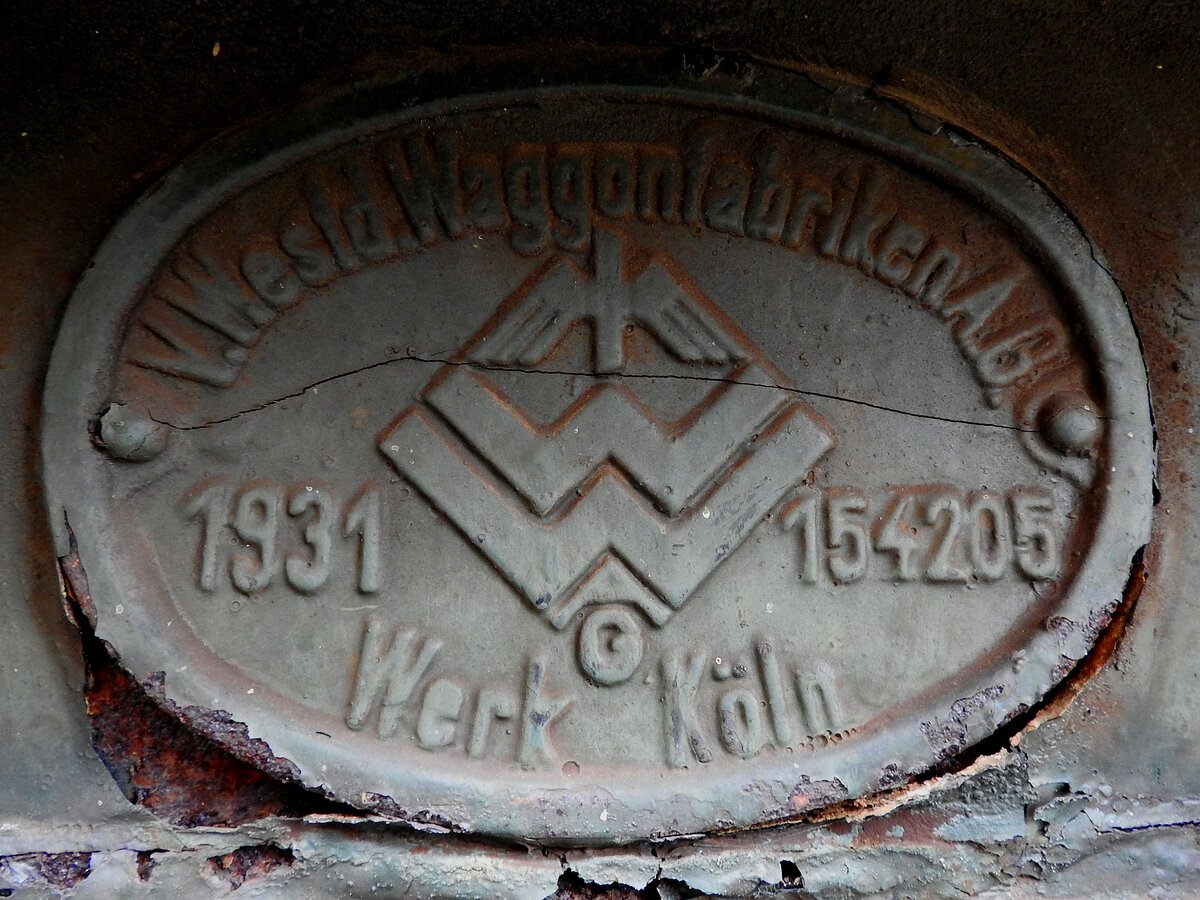 Fabrikationsschild  V.Westd.WaggonfabrikenAG. 1931-154205 Werk-Köln  an einem abgestellten Personenwagen im Bereich Timelkam; 220416