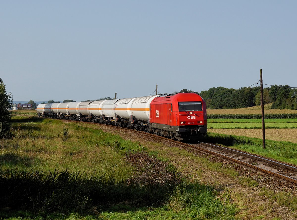 Die 2016 072 mit einem Gaskesselzug am 25.08.2017 unterwegs bei Uttendorf-Helpfau.