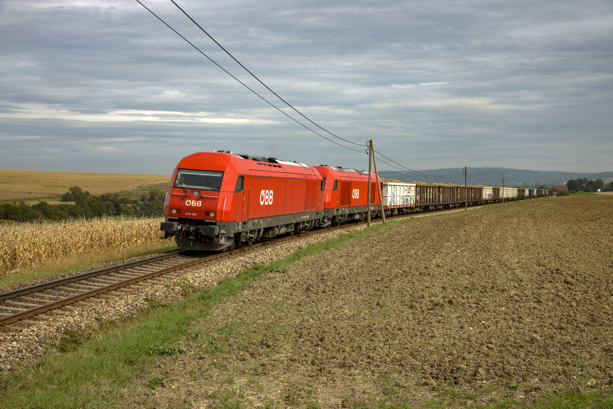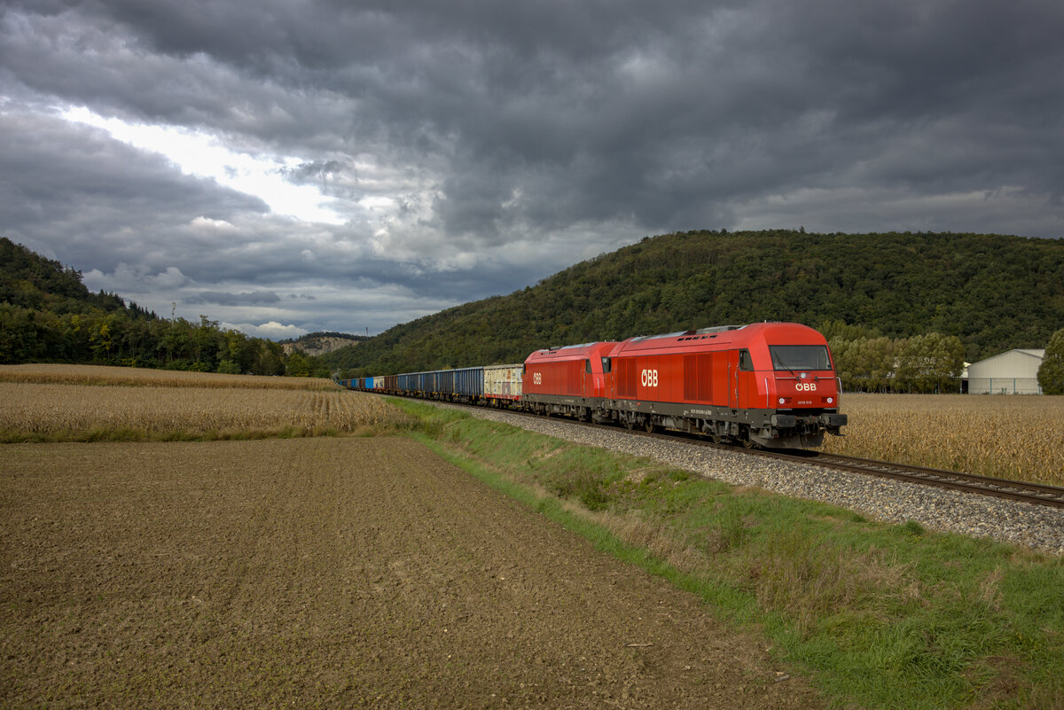 Hercules" in Doppeltraktion.. ÖBB 2016 071-9 und 2016 068-5 vor einem langen schweren "Schlierenwagen" - Zug. Schön deutlich erkennbar die unterschiedlichen Seitenwände des Hercules. Lok 2 fährt Führerstand 2 voraus.