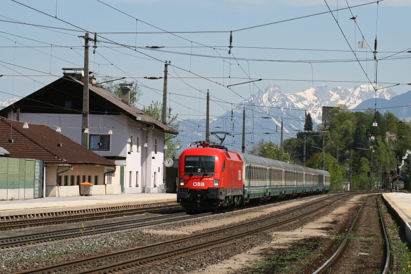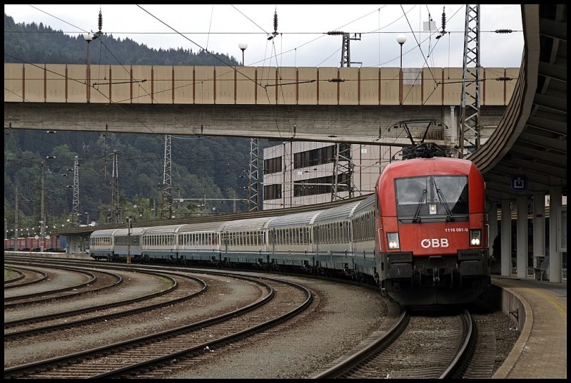 1116 137-6, mit EC 87 "Tiepolo" am Haken, eilt Innsbruck entgegen. Aufgenommen beim Bahnbilder-Treffen in Durchfahrt Brixlegg, 20. Juni 2009. Helmut Dimitroff