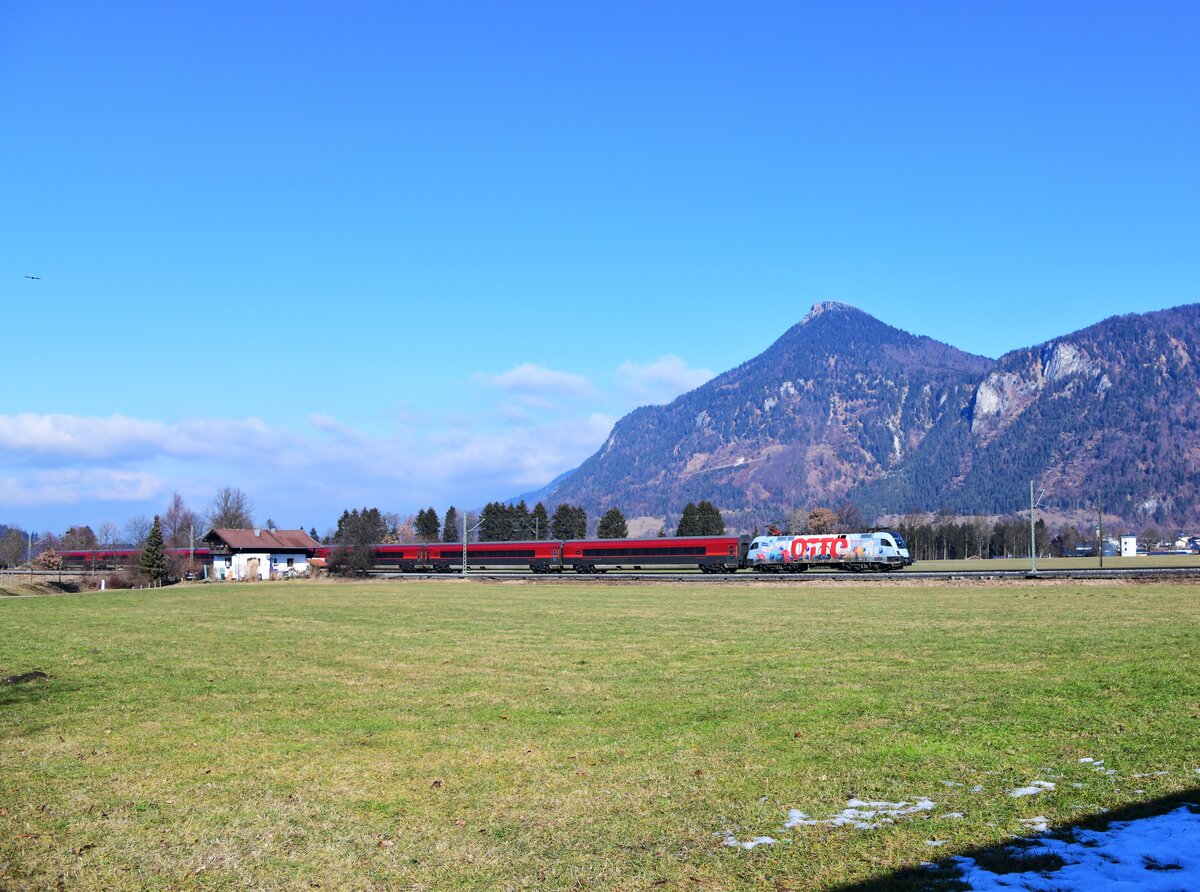 1116 216 "200 Jahre Johann Strauss" schob am 28. Februar 2026 bei Axdorf im Chiemgau eine "Railjet-Garnitur" in Richtung Salzburg.