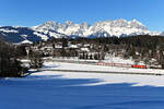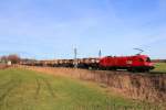 1016 043 und 1116 185 waren am 10. Februar 2026 mit einem gemischten Güterzug bei Übersee am Chiemsee in Richtung Salzburg unterwegs.