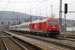 Der ÖBB-Taurus 1016 020-1 "Profis am Werk" beförderte am 10.12.2025 einen Kesselwagenzug durch Würzburg gen Osten.