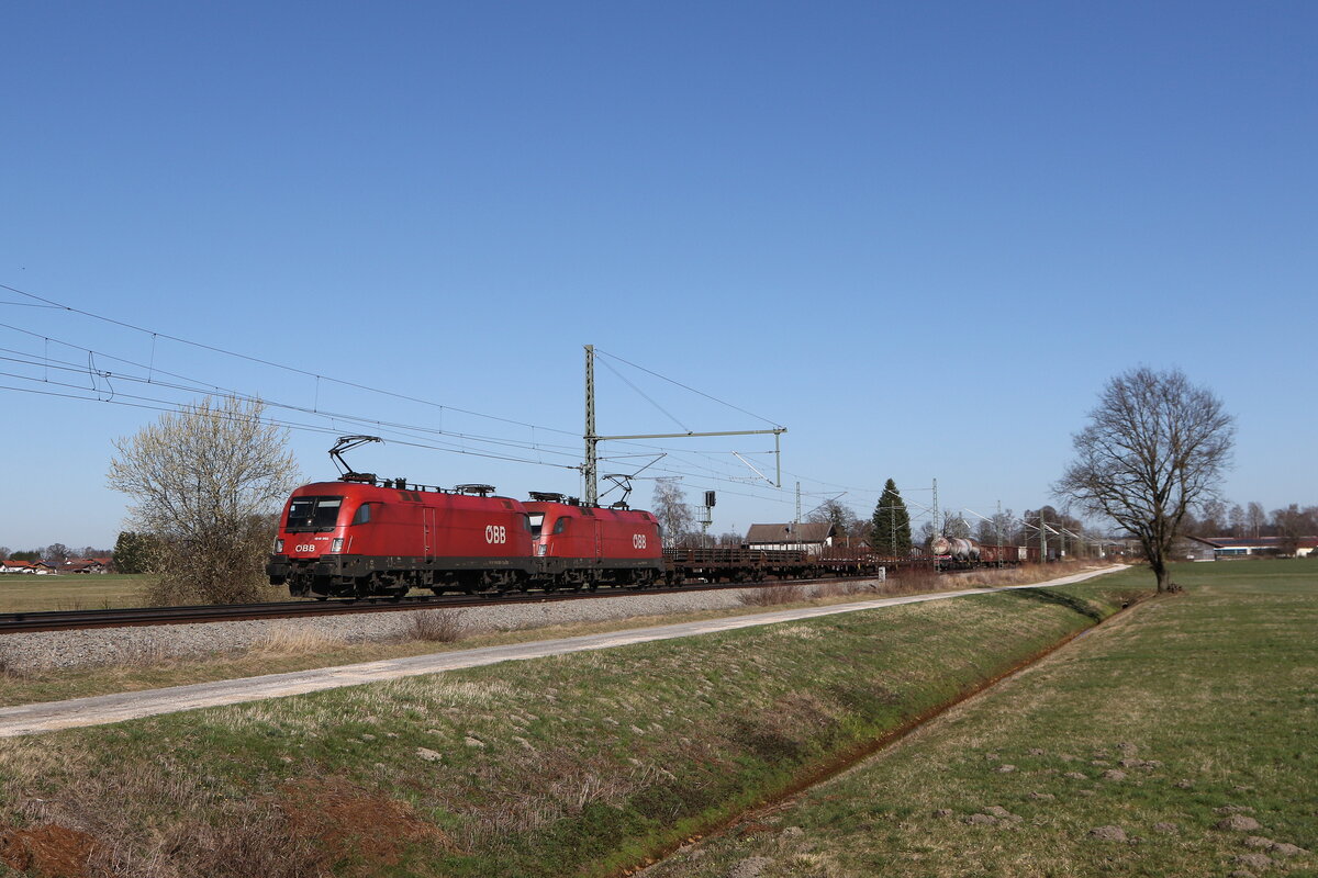 1016 050 und 1016 003 mit einem gemischten Güterzug aus Salzburg kommend am 13. März 2026 bei Übersee am Chiemsee.