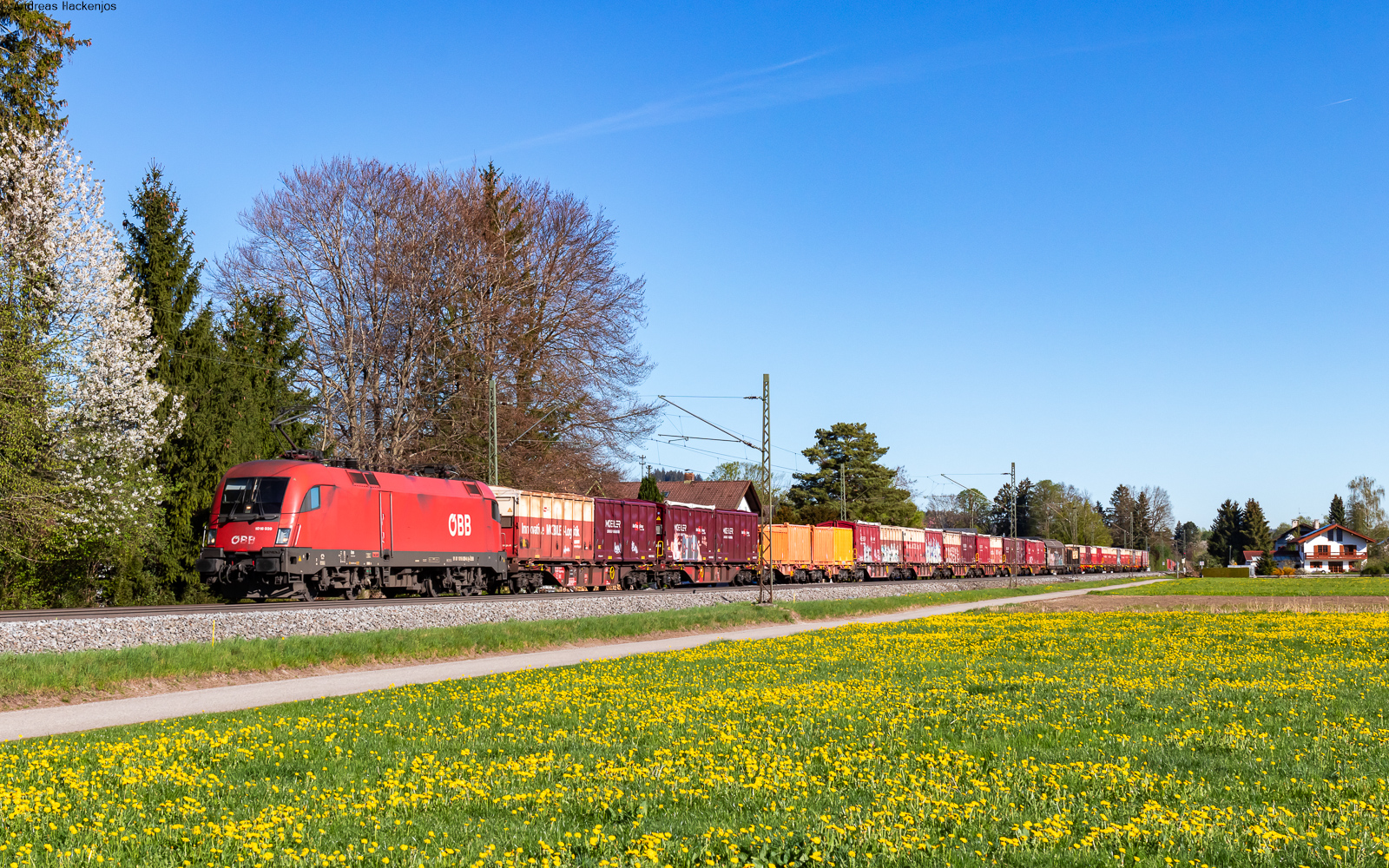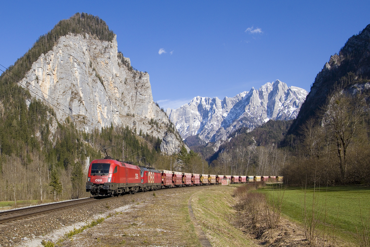 1016 043 und 1116 185 waren am 10. Februar 2026 mit einem gemischten Güterzug bei Übersee am Chiemsee in Richtung Salzburg unterwegs.