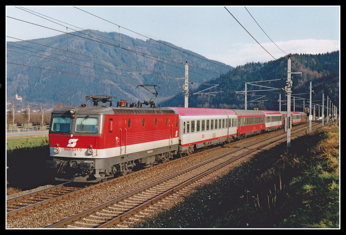 1044 041 fährt am 1.12.2003 mit IC535 (Wien - Villach) bei Niklasdorf durchs Murtal. Man beachte die Wagengarnitur, von einheitlichen Erscheinungsbild kann hier keine Rede sein.