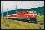 Mit einem Schnellzug von Villach Hbf nach Wien Südbahnhof fährt im Februar 2002 die, im Schachbrett-Design gestaltete 1044 092 zwischen Neumarkt in Steiermark und Mariahof-St.Lambrecht den  Neumarkter Sattel bergwärts.