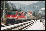 Mit einem Schnellzug von Villach Hbf nach Wien Südbahnhof fährt im Februar 2002 die, im Schachbrett-Design gestaltete 1044 092 zwischen Neumarkt in Steiermark und Mariahof-St.Lambrecht den "Neumarkter Sattel bergwärts.