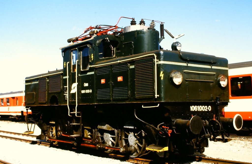 Österreich 1983: Die schon beinahe museale Ellok 1061.01 (ÖBB) beim Rangieren, Ort unbekannt