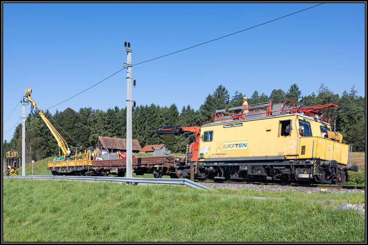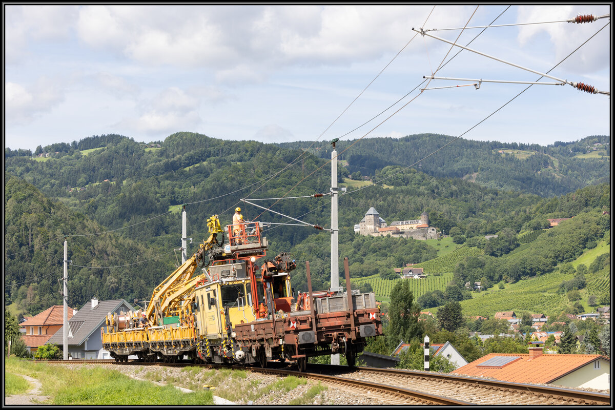 Zweifachtraktion ÖBB Taurus 1116 267 + railjet 1116 215 mit Zug eurailpool Gleisbauwagen MFS-100 in Richtung Wörgl bei Durchfahrt in Westendorf / Tirol; 15.06.2017