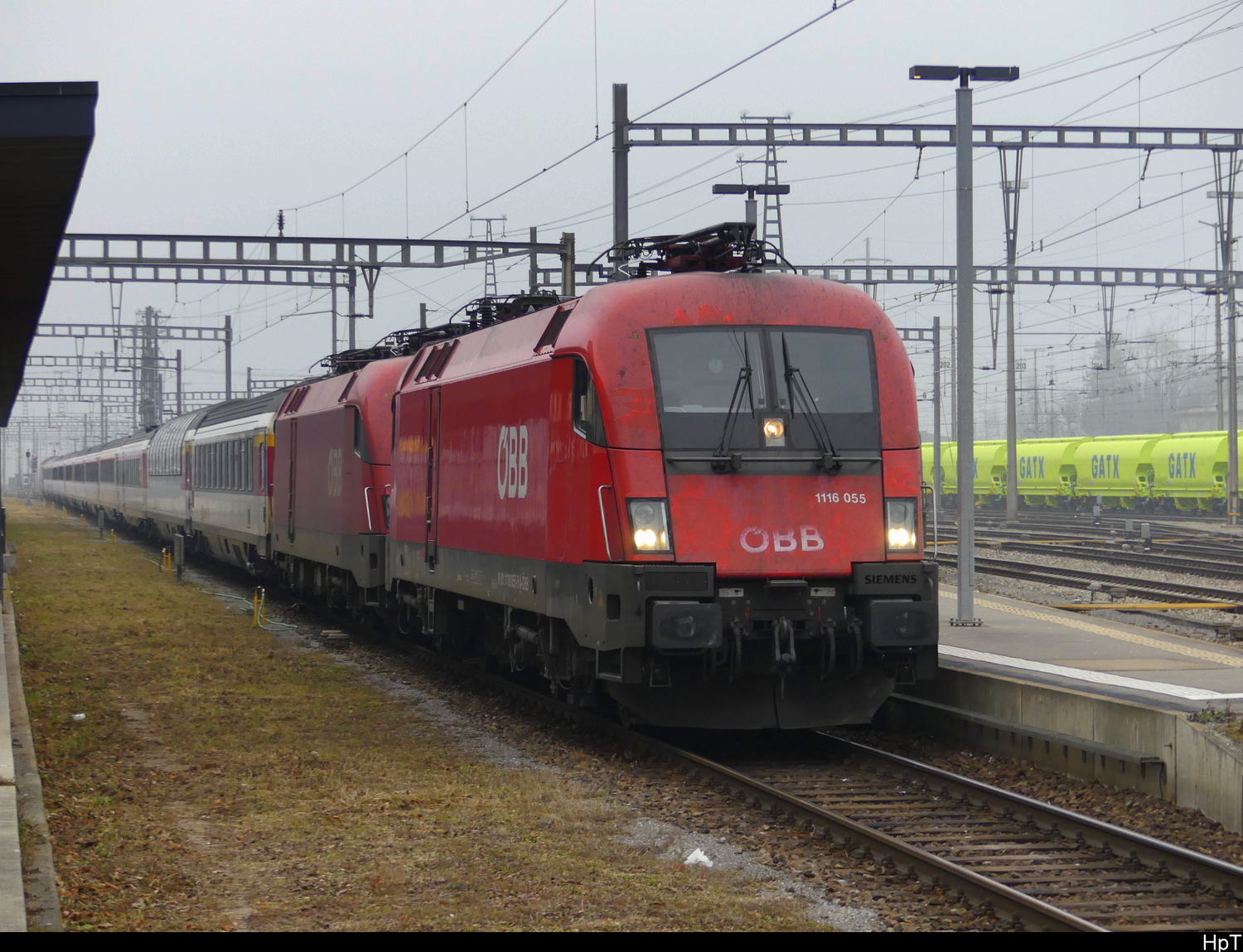 ÖBB - - Loks  1116 055 + 1116 131-4 bei der Übernahme eines EC im Bahnhof Buchs /SG am 26.12.2025
