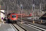1116 039 war mit einem gemischten Güterzug am 20. März 2026 bei Übersee am Chiemsee in Richtung München unterwegs.