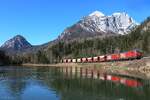 Vor der gewaltigen Bergkulisse fahren am 6.3.2025 die 1144 223 und die 1116 190 mit einem gemischten Güterzug von Graz Vbf nach Linz Vbf hier kurz hinter Gstatterboden.