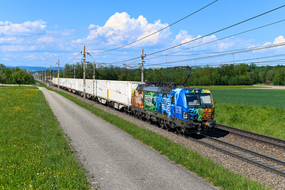 Mit einem einheitlich beladenen Containerzug war am frühen Nachmittag des 01. Mai 2025 die 1116.282 durch das Hausruckviertel in Richtung Passau unterwegs. Bei dem Zug könnte es sich um die Leistung aus der Türkei nach Aalen gehandelt haben. Hierbei werden Bosch Hausgeräte aus türkischer Fertigung nach Deutschland transportiert.