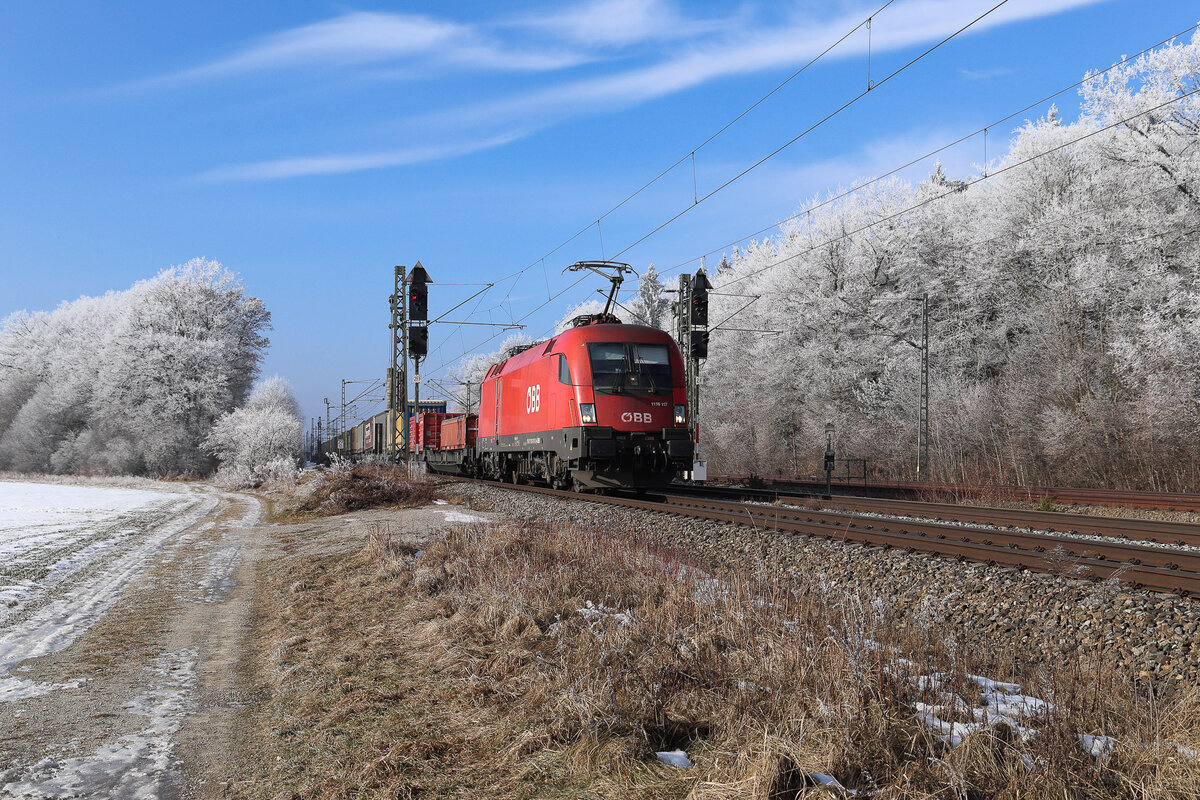 Die 1116 137 und die 1116 162 mit einem Güterzug am 11.02.2012 unterwegs bei Fieberbrunn.
