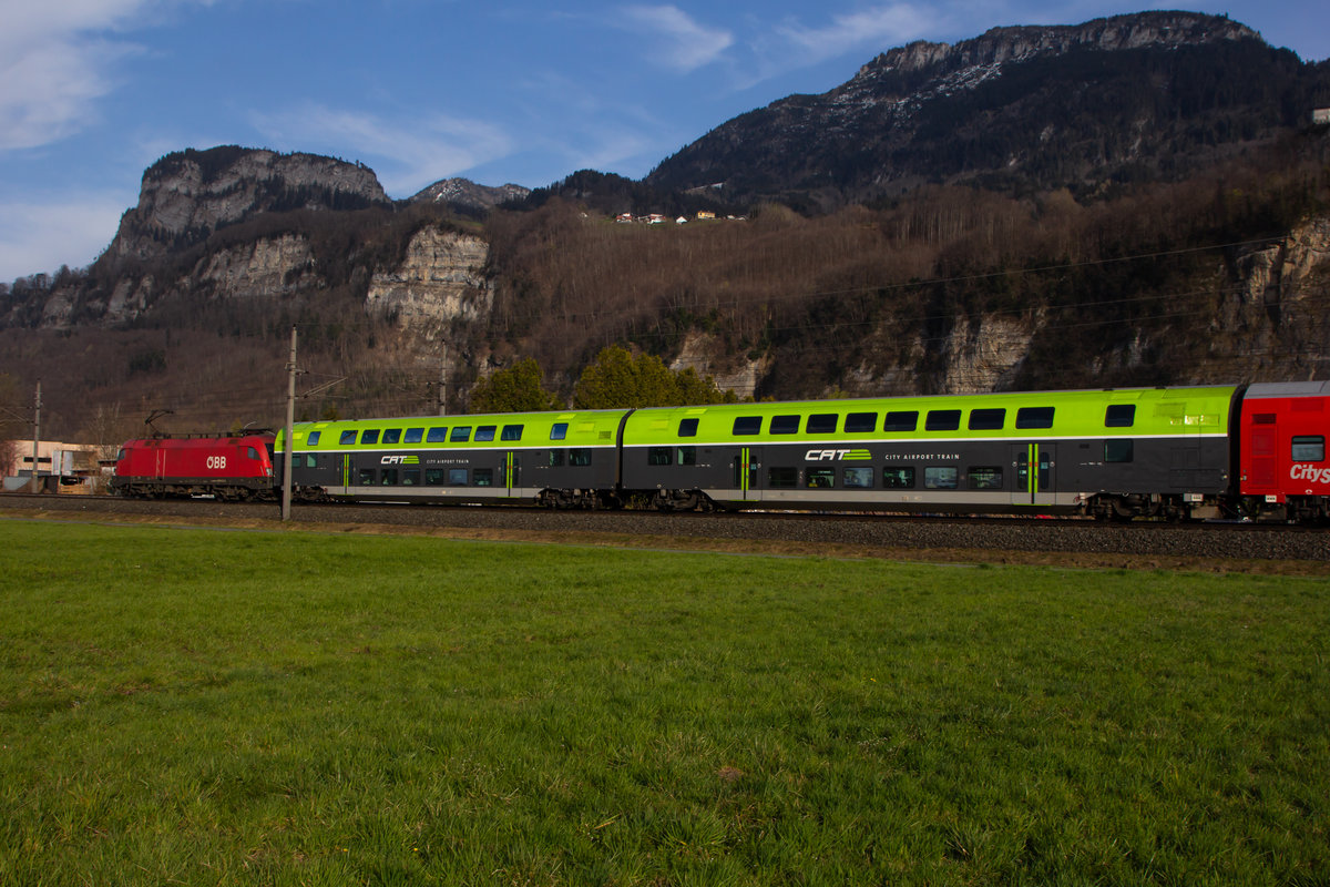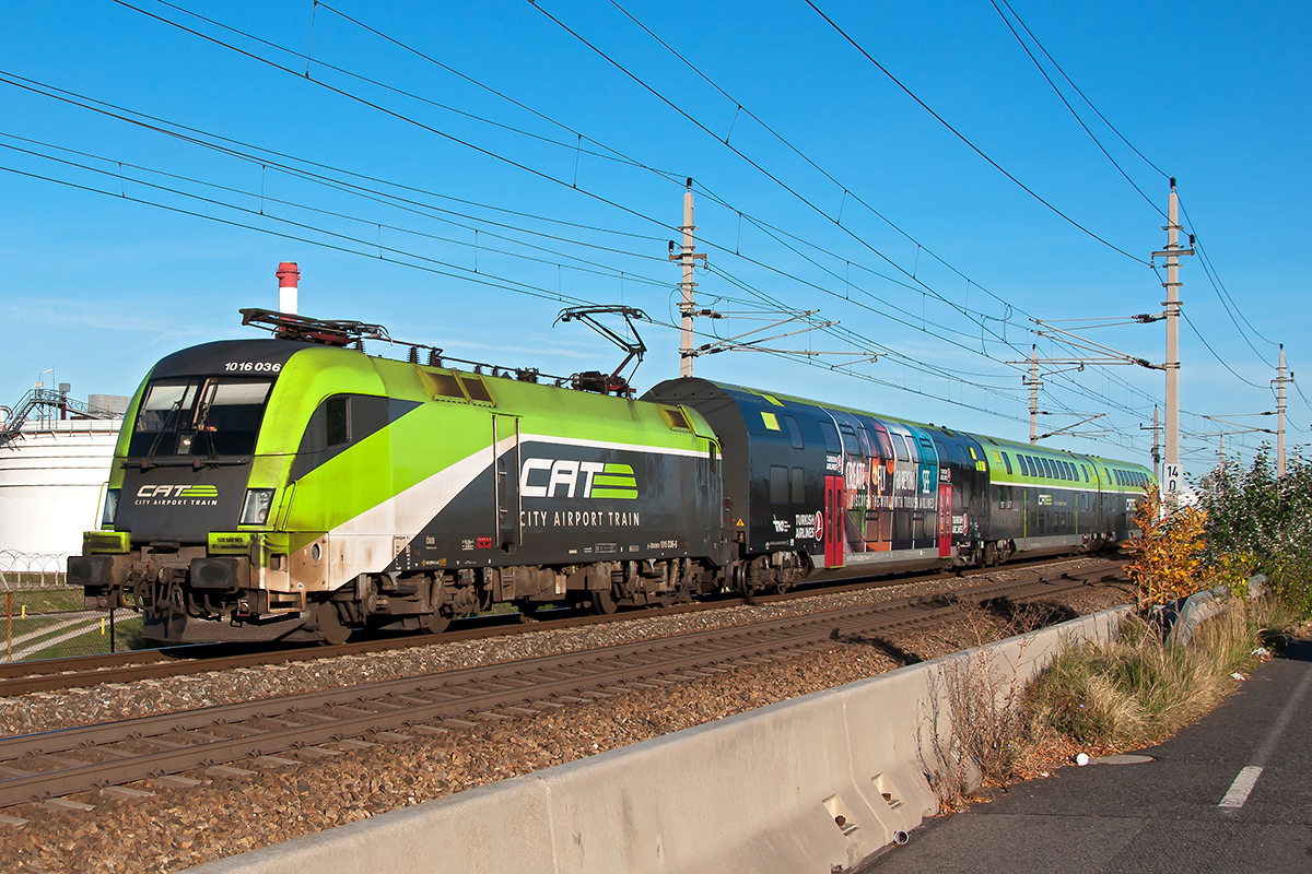 1016 036 ist mit dem City Airport Train 9054 nach Wien Mitte unterwegs. Die Aufnahme entstand kurz nach der Haltestelle Mannswörth.