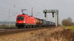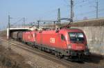 1116 039 war mit einem gemischten Güterzug am 20. März 2026 bei Übersee am Chiemsee in Richtung München unterwegs.