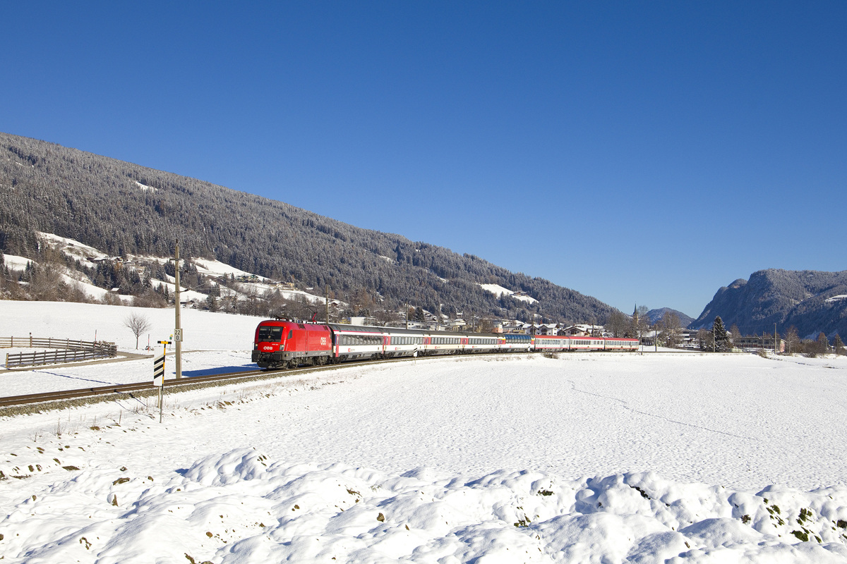 Am 23. November 2024 war 1116 267 ab Selzthal mit dem EC 164  Transalpin  (Graz Hbf - Zürich HB) unterwegs und ist hier zwischen Radstadt und Altenmarkt im Pongau zu sehen.