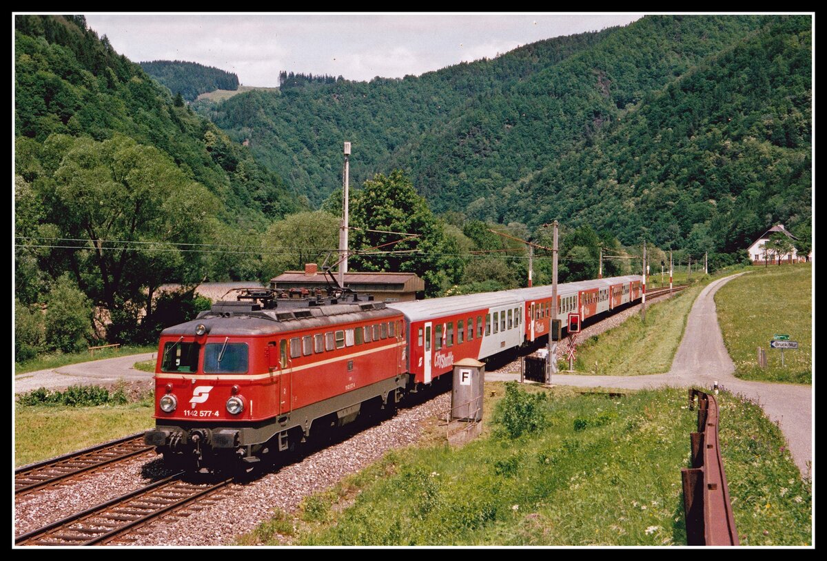 Lange Zeit beherrschten Wendezuggarnituren + 1142 den Nahverkehr zwischen Bruck/Mur und Graz Hbf. Hier zu sehen 1142 577 mit R4021 zwischen Bruck/Mur und Pernegg am 29.05.2002. Heute wird diese Linie als S1 bezeichnet und es fahren nur mehr Triebwagen.