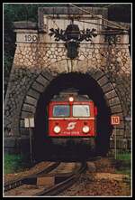 Lokbespannte Regionalzüge am zwischen Bruck/Mur und Friesach gehören schon längst der Vergangenheit an. Im Februar 2002 rollt die 1142 550 zwischen Mariahof-St.Lambrecht und Neumarkt in Steiermark mit einem "CityShuttle" Wendezug in Richtung Süden.