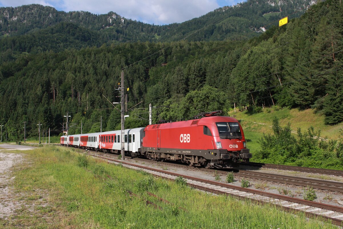 Im Bahnhof Selzthal wartet am 12.12.2025 die 1144 056 mit dem D16756 von Graz Hbf nach Linz Hbf nach dem Personalwechsel auf die Weiterfahrt. Der Verstärkerzug fuhr Freitags und Sonntags als Entlastung für die Interregio Verbindung.