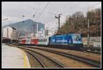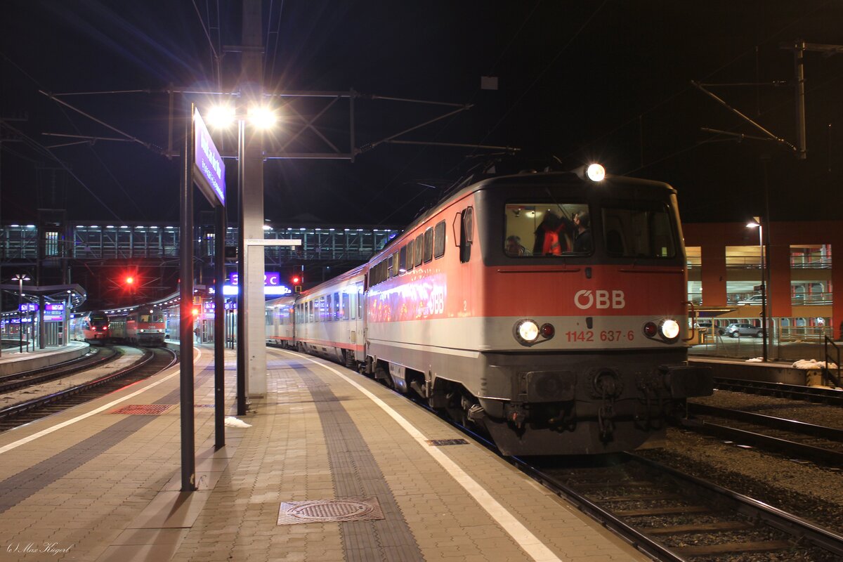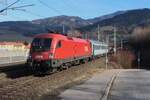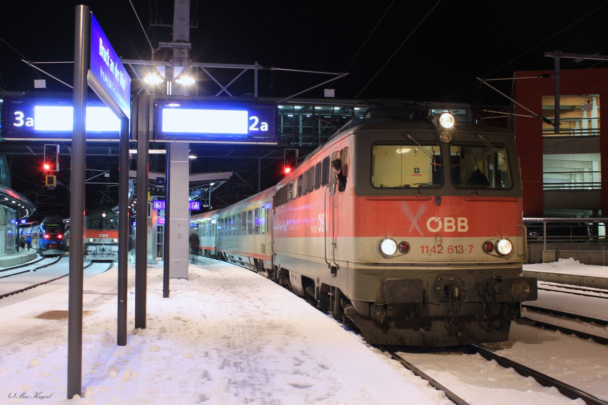 Die 1142 613 bespannte am 9.2.2015 den EC150 "Emona" von Spielfeld-Straß nach Wien Hbf hier beim Aufenthalt in Bruck an der Mur.