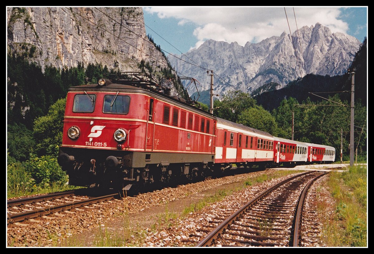 Am verregneten 21.5.2025 fuhren die 1142 683 und die 1144 098 mit einem gemischten Güterzug von Bruck an der Mur nach Linz Vbf und verlassen hier den Bahnhof Admont in Richtung des Gesäuse.