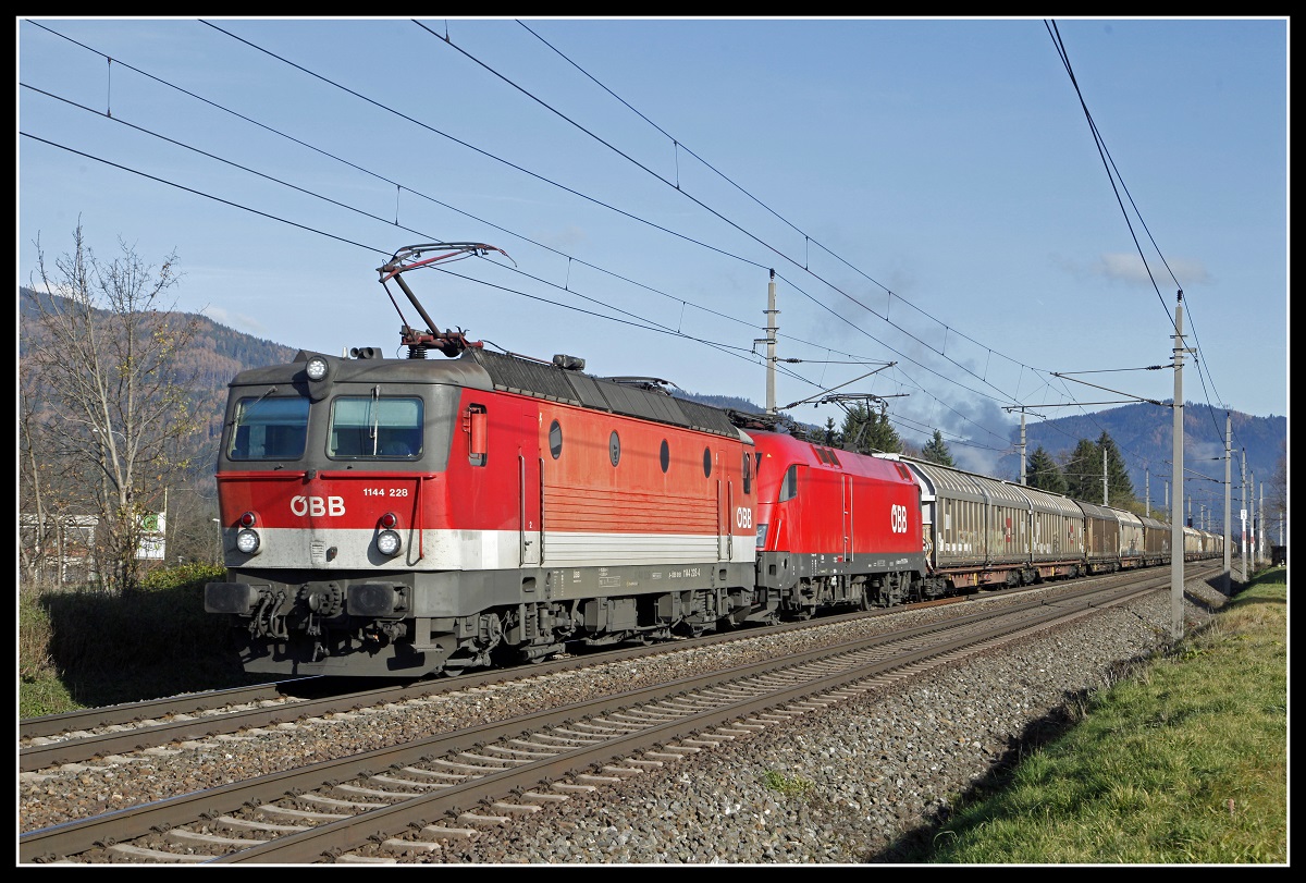 1144 228 + 1116 174 mit Güterzug bei Niklasdorf am 22.11.2019.