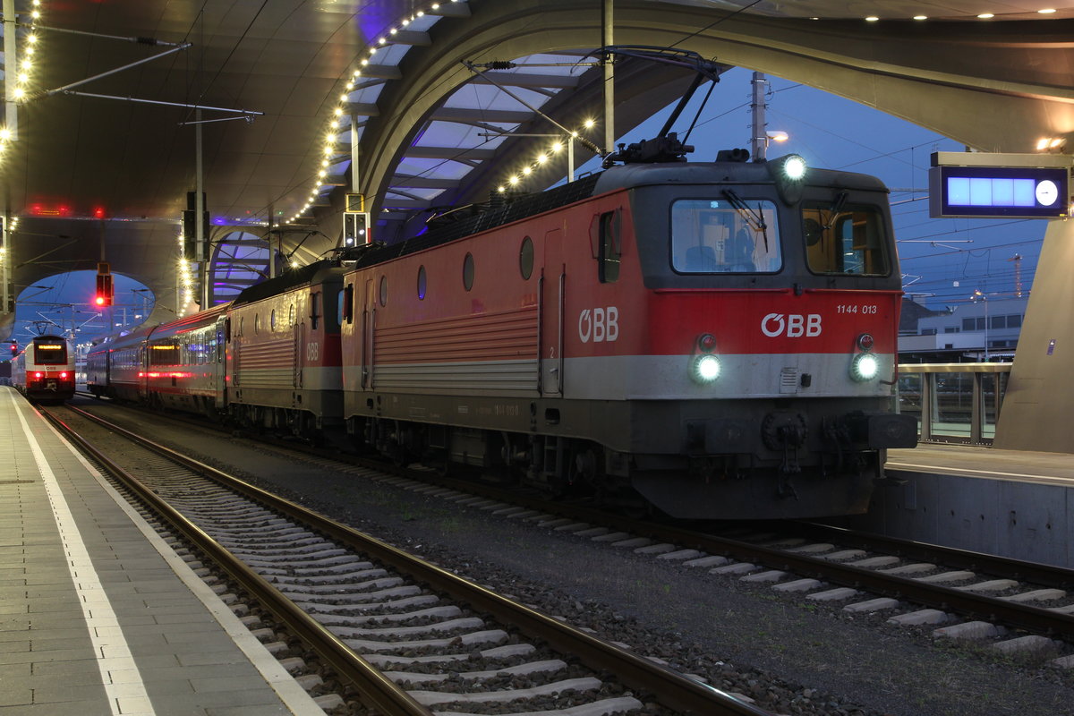 Kurz vor der Abfahrt steht am 25.5.2020 der D852 mit 1144 013 und 1144 224 bespannt.in Graz Hbf.
