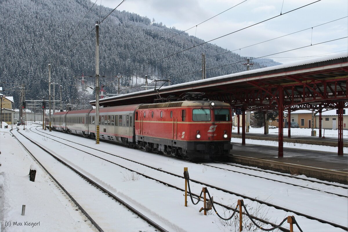 Im Bahnhof Selzthal wartet am 12.12.2025 die 1144 056 mit dem D16756 von Graz Hbf nach Linz Hbf nach dem Personalwechsel auf die Weiterfahrt.