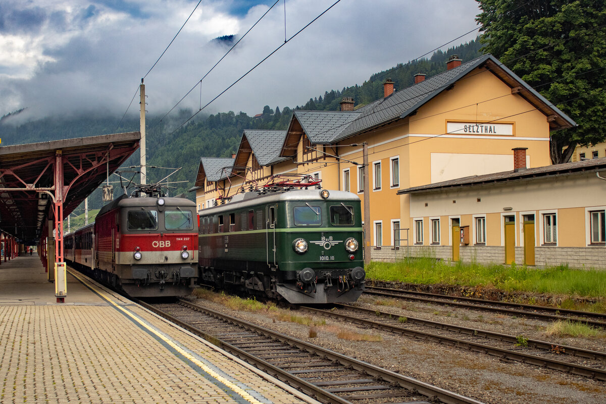 Die 1116 267 sowie die 1116 094 mit einem Kesselwagenganzzug von Ingolstadt nach Graz Vbf und dahinter die 1116 149 und die 1144 266 mit einem gemischten Güterzug von Linz Vbf nach Bruck/Mur Fbf. Max Kiegerl