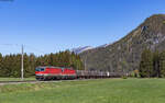 Mit eimem voll beladenen Schotterzug vom Hartsteinwerk in Preg fährt die 1144 049 am 4.6.2024 von Fentsch-St.Lorenzen nach Graz Vbf hier kurz vor Stübing.