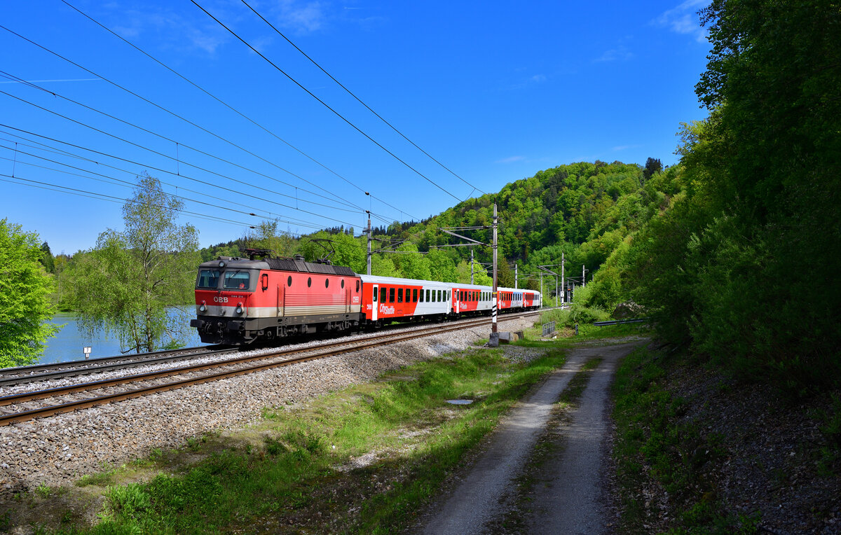 Der InterCity überquert hier im Bahnhof Angertal die über 110 Jahre alte Angertalbrücke auf der Nordrampe der Tauernbahn.