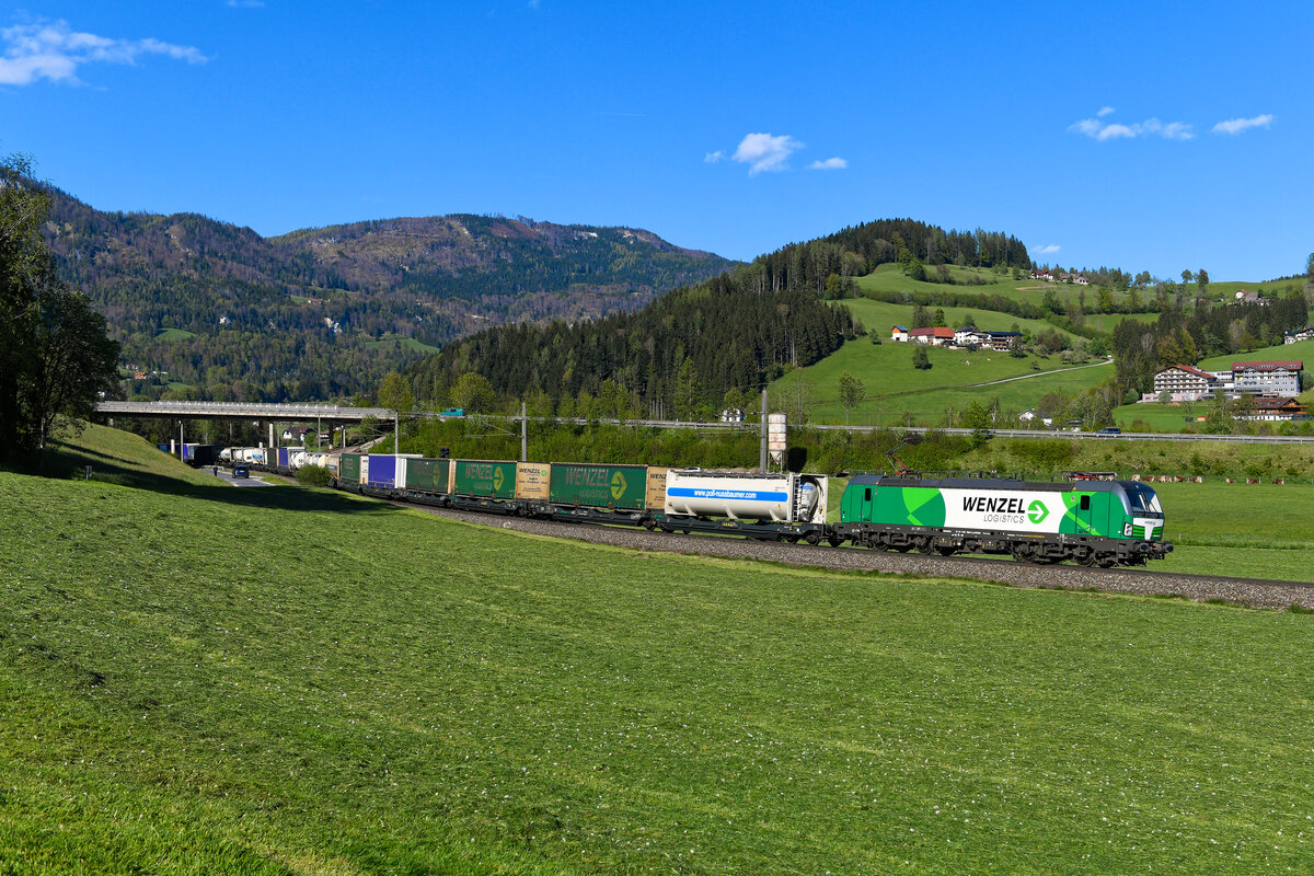 Regulär auf der Pyhrnbahn verkehrt der sogenannte Wenzel-KLV. Diese Leistung wurde in der Vergangenheit spektakulär bespannt, unvergessen sind die Einsätze der Loks der Baureihen 1110 oder 1014 von der längst insolventen Firma Zeller Transporttechnik. Inzwischen werden zwei Vectrons der Weco Rail eingesetzt, die im Design der Spedition Wenzel Logistics gehalten sind. Am 27. April 2024 war der TEC 41909 von Neuss Gbf nach Kalsdorf-Terminal vor der Planzeit unterwegs und konnte bei besten Lichtverhältnissen zwischen Windischgarsten und Spital am Pyhrn fotografiert werden. Christoph Schneider