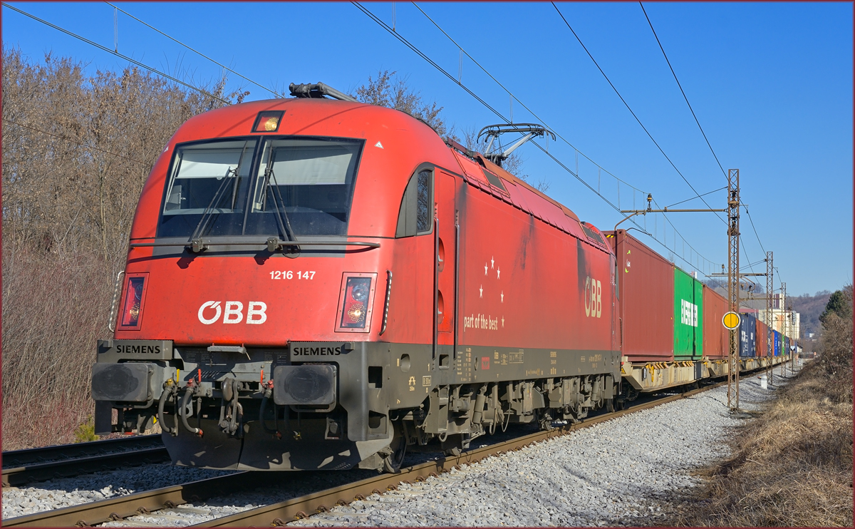 OBB 1216 147 zieht Containerzug durch Maribor-Tabor Richtung Koper Hafen. /18.2.2021