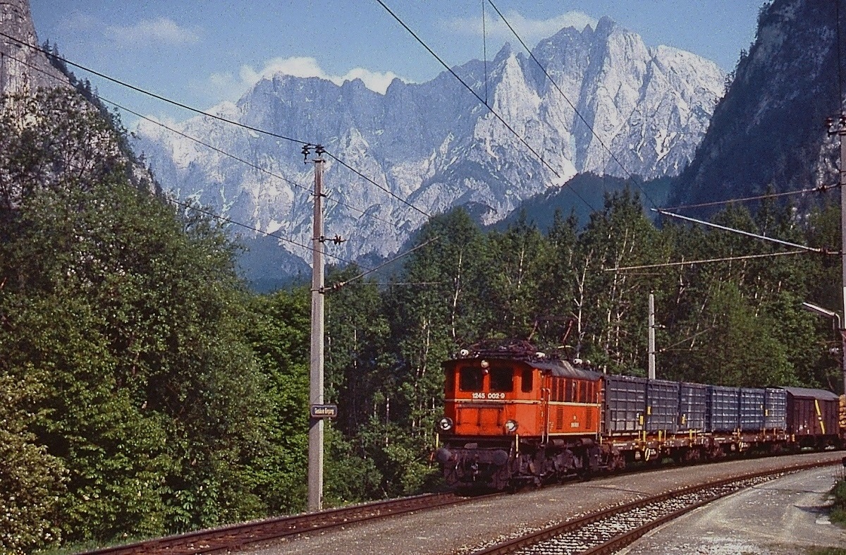 Im September 1986 durchfährt 1245 002-9 den damals noch existierenden Bahnhof Gesäuse Eingang