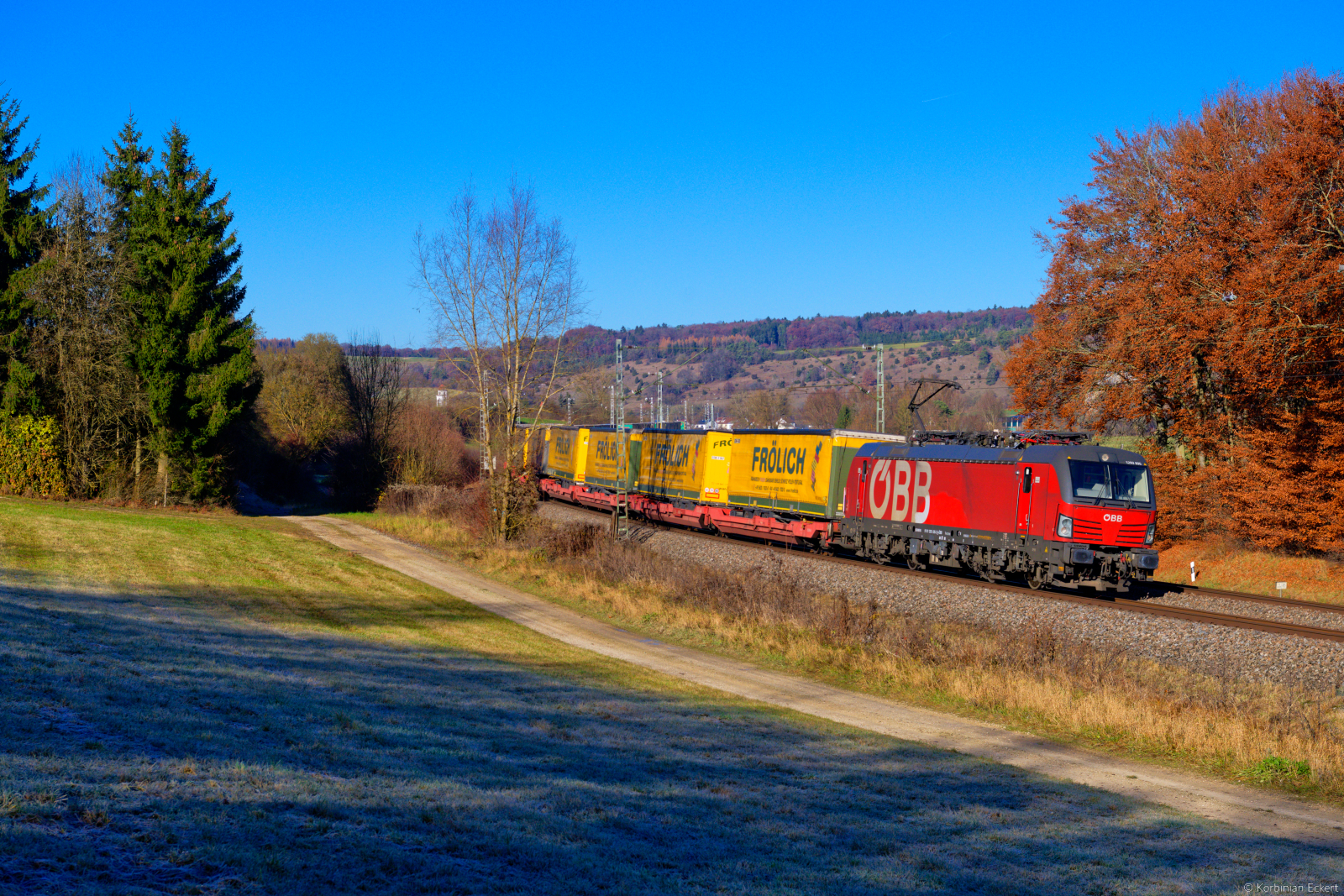 Mit einem bescheidenen Zug donnert eine 193er und eine 1144 am Mittag des 19. Februar 2026 gen Süden .