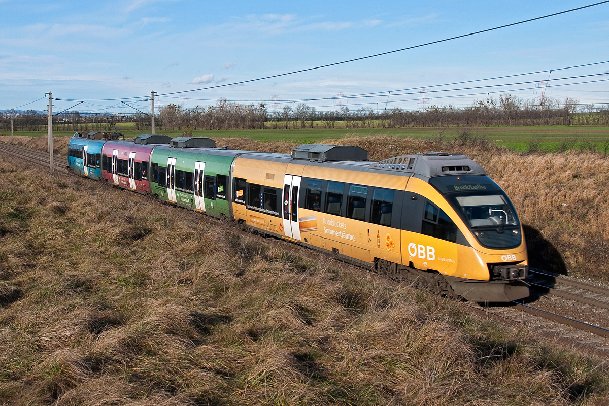 4124 013  Kombiticket  fährt von Bruck an der Leitha nach Wien Hütteldorf. Die Aufnahme entstand kurz nach Gramatneusiedl am 19.12.2014.