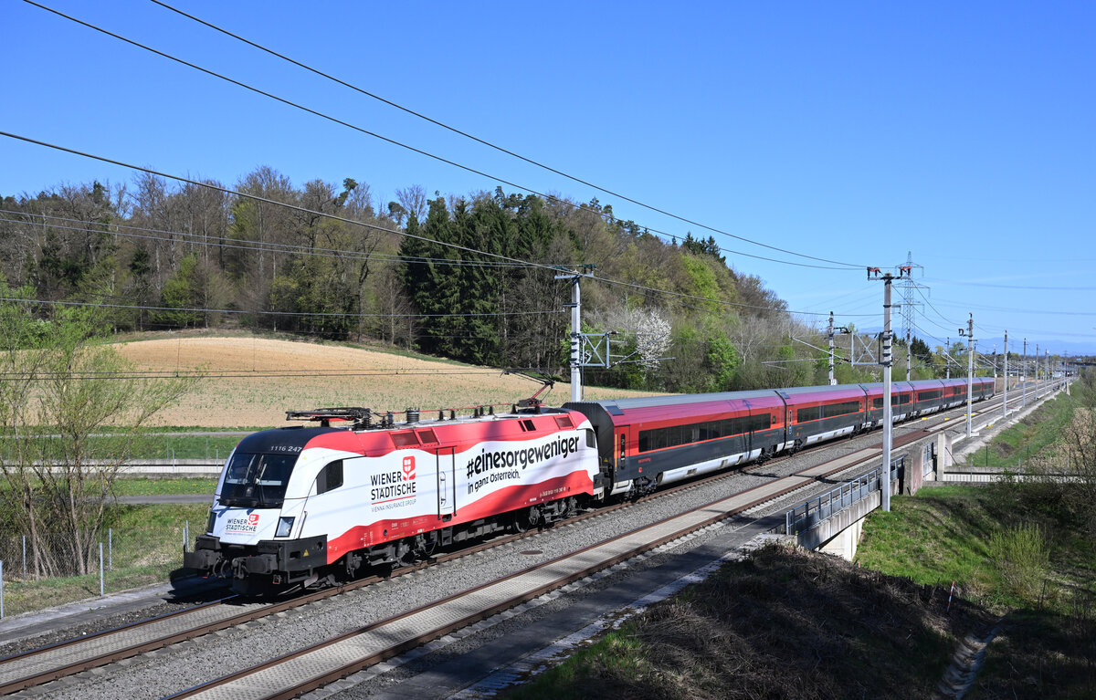 1116 154  Zugkraft für Europa  schob einen Railjet in Richtung Salzburg. Aufgenommen am 19. März 026 bei Axdorf im Chiemgau.