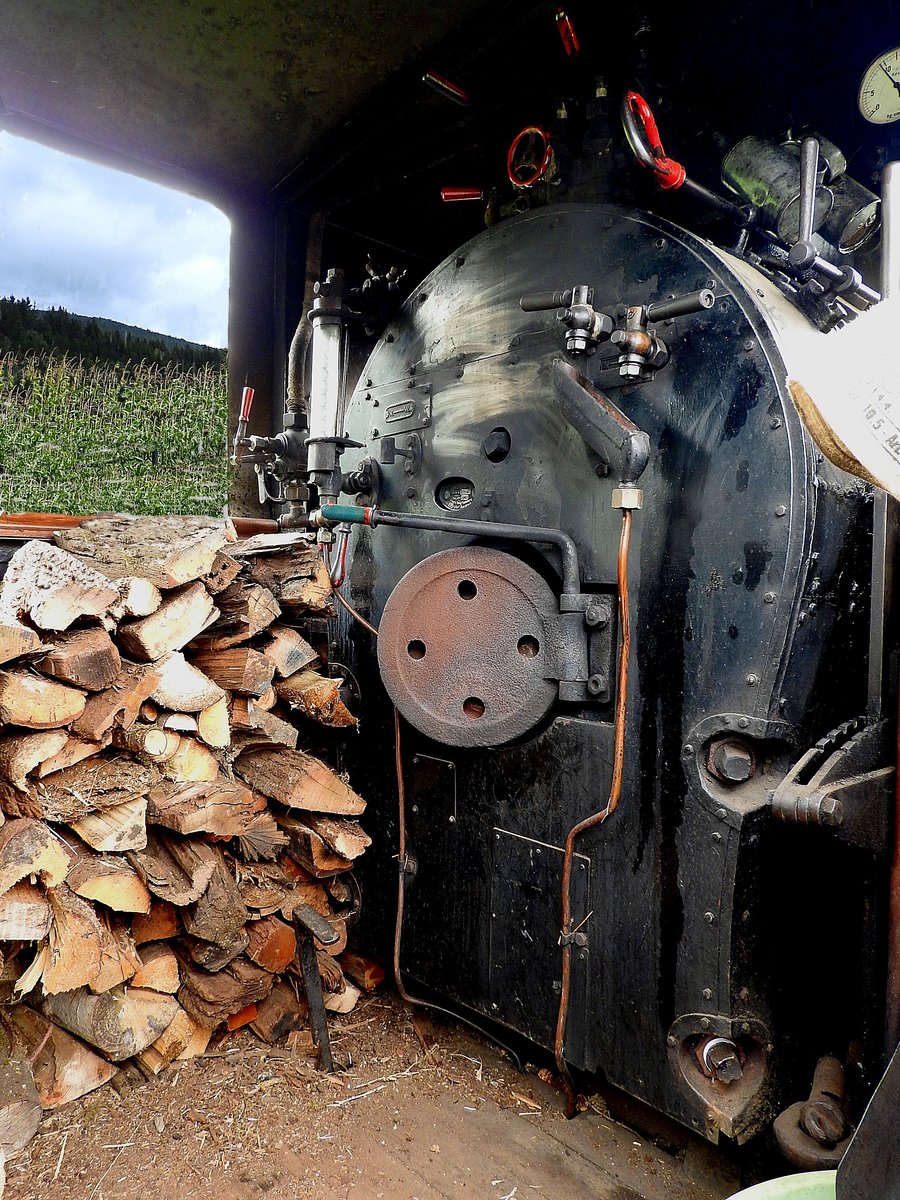 Dampf-Energiequelle  in Form von aufgestapeltem Holz liegt vor der Brennkammer von Lok13 bereit; 170903