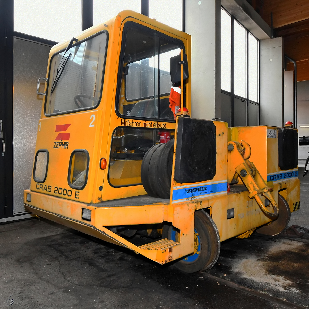 Das Akku-Rangierfahrzeug Zephir Crab 2000 E war im Ringlokschuppen im Lokpark Ampflwang zu sehen. (August 2020)