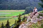 Das könnte eine Szene bei der österreichischen Lokalbahn Weiz-Birkfeld darstellen. Lok StLB RT 3 mit einem Wagen an einem unbekannten Ort (wo könnte das sein?), 15.07.1986
