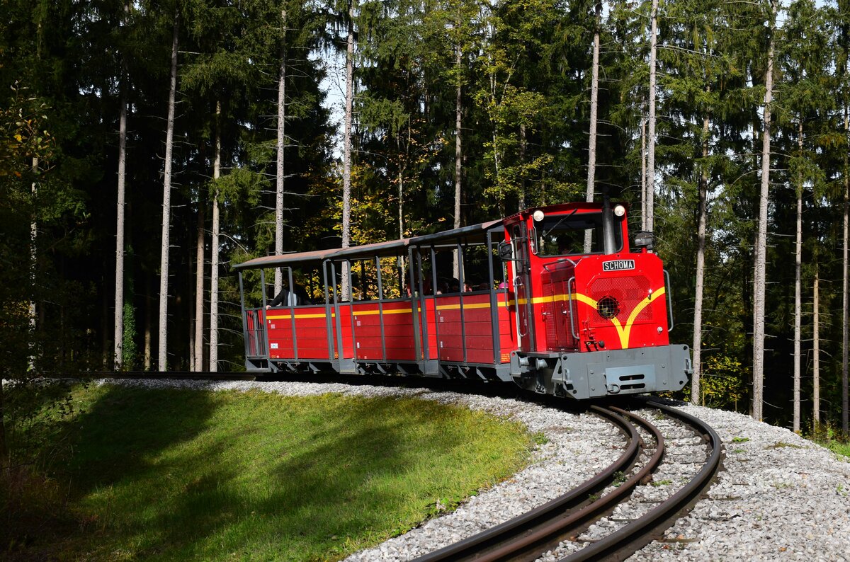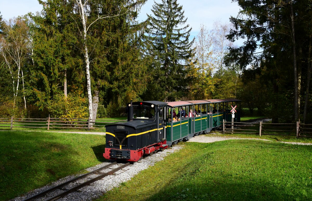 Das Bild zeigt einen der Züge mit der schwarzen Schöma Lokomotive Vf 3 "Grossglockner" im Salzburger Freilichtmuseum. Großgmain, 29.10.2023.