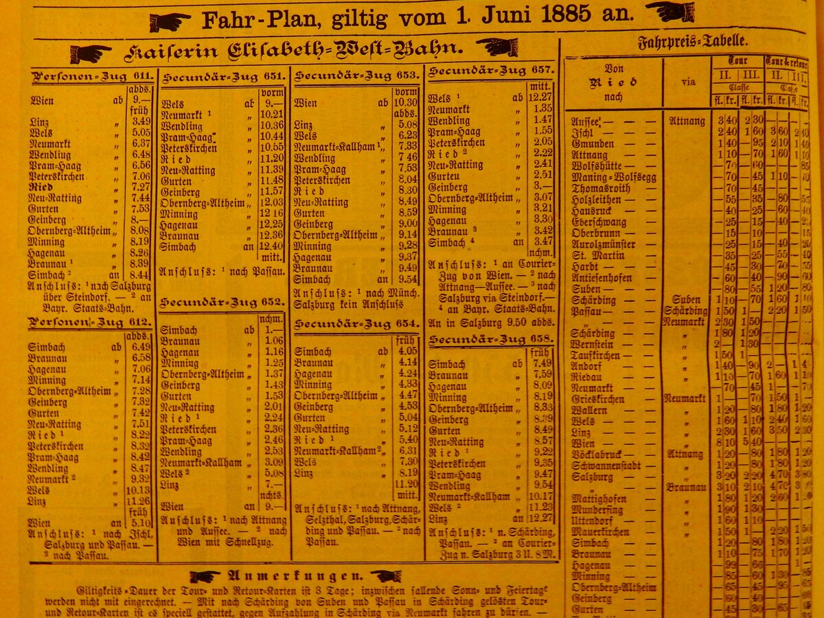 Fahrplan der Kaiserin-Elisabeth-West-Bahn, giltig vom 1.Juni 1885; Quelle Sonntagsblatt-Innviertel; Aufnahmedatum:241127